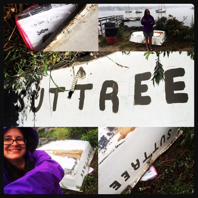 On the North-Western tip of the island, looking towards North Haven, I found a little boat going by the name of ‘Suttree’. As many know, the novel Suttree, by Cormac McCarthy, is one of two primary texts that I am focusing on for my dissertation (the other being Joyce’s Ulysses), but it is also one of McCarthy’s lesser known works (though his best IMHO). I, and all lovers of McCarthy’s work, get ridiculously excited about any references to this novel. As some of you may recall from earlier posts, my friend Wes Morgan, from Knoxville, has an entire blog devoted to this book, called Searching For Suttree, which you can check out here. It’s worth your time (as is a visit to Knoxville if you get the chance). Anyway, I digress… I found this little boat yesterday while the sun was shining and sent Wes an excited message this morning, to which he replied, amongst other things: “Take more pics and a selfie to post.” Excellent plan! The weather had turned by this afternoon, so I returned in my raincoat, took a bunch of photos and asked a passerby to snap me beside the boat. I also wrote the boat-owner a letter and left it in a ziplock bag, asking him/her the origin and significance of the boat’s name and whether s/he’s familiar with McCarthy’s work (of course s/he is!) – I provided both Wes’s and my snail, email and web addresses, so we’ll see if s/he responds.